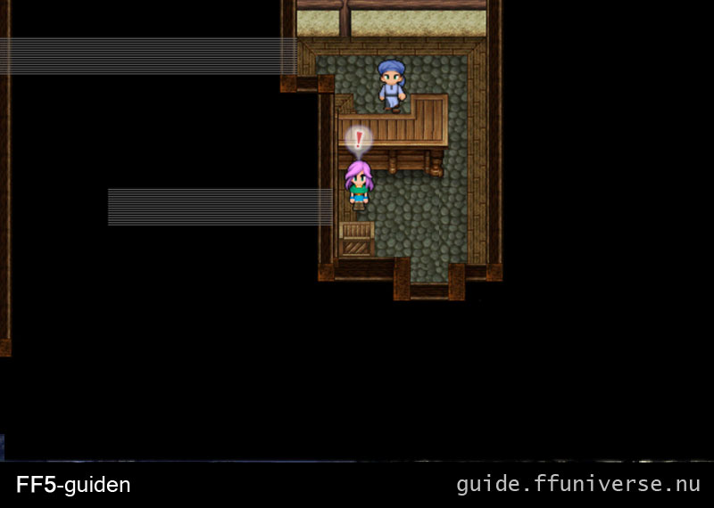 Gå på ovansidan av pubben för en hemlig dörr. Gå in i baren och undersök en av lådorna där för en Theif’s Knife som ibland gör Mug automatiskt. Fortsätt till vänster och ned trappan. Du hamnar i ett rum med en man som frågar om du kan ta en chocobo jorden runt, gå vidare ned och ut genom dörren.