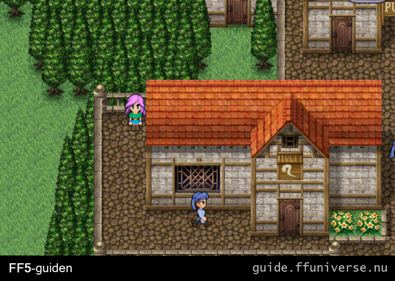 Du står i en lång gång, gå ned för den tills den går vidare till höger. Till vänster finns en lönngång i väggen, trappan här tar dig upp till en svart Chocobo du kan ta för att få flyga runt på kartan. Från det rummet kan du gå vänster igen genom väggen för att nå byns piano. Men om du struntar i lönngångarna och istället går till höger och upp för gången så kommer du till en hemlig del av vapenaffären. Du står nu vid en köpman som säljer dig många bra vapen (den vanliga affären är under dig), bland annat Fuma Shuriken (sjukt dyr så klart).